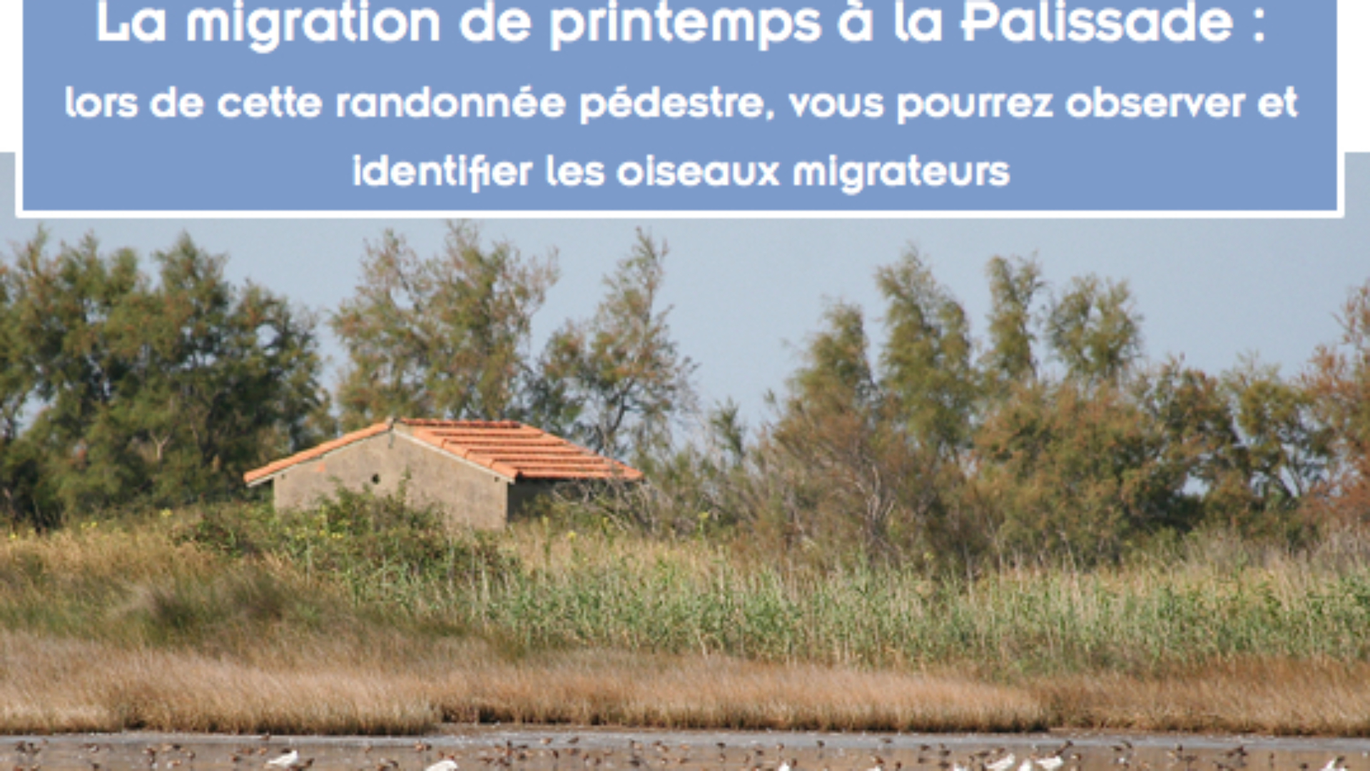 Une visite guidée intitulée "La migration de printemps à la Palissade" aura lieu le 12 avril à 9h30 au Domaine de la Palissade. Lors de cette randonnée pédestre vous pourrez observer et identifier les oiseaux migrateurs.