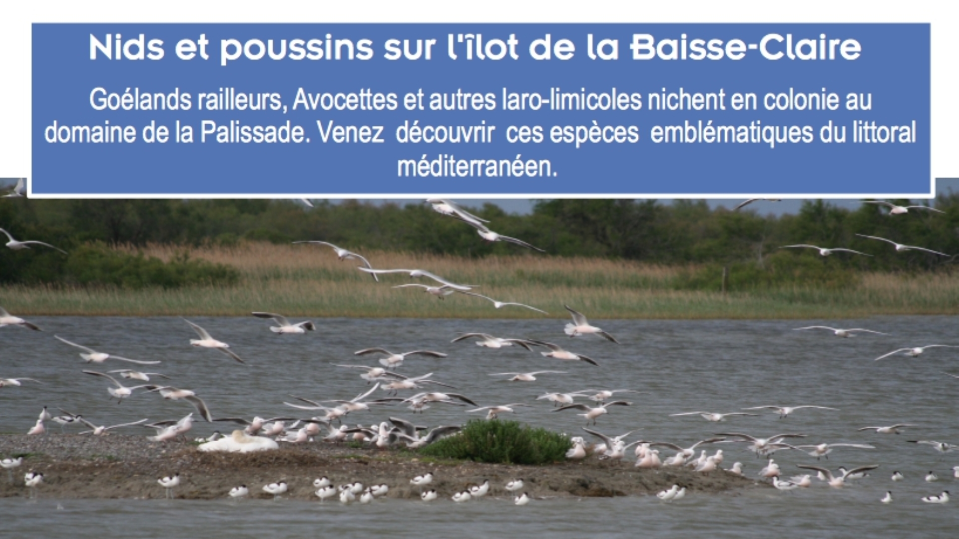 Une visite guidée intitulée " Nids et poussins sur l'îlot de la Baisse-Claire " aura lieu le 28 mai de 9h30 à 12h au Domaine de la Palissade. Goélands railleurs, Avocettes et autres laro-limicoles nichent en colonie au domaine de la Palissade. Venez découvrir ces espèces emblématiques du littoral méditerranéen.