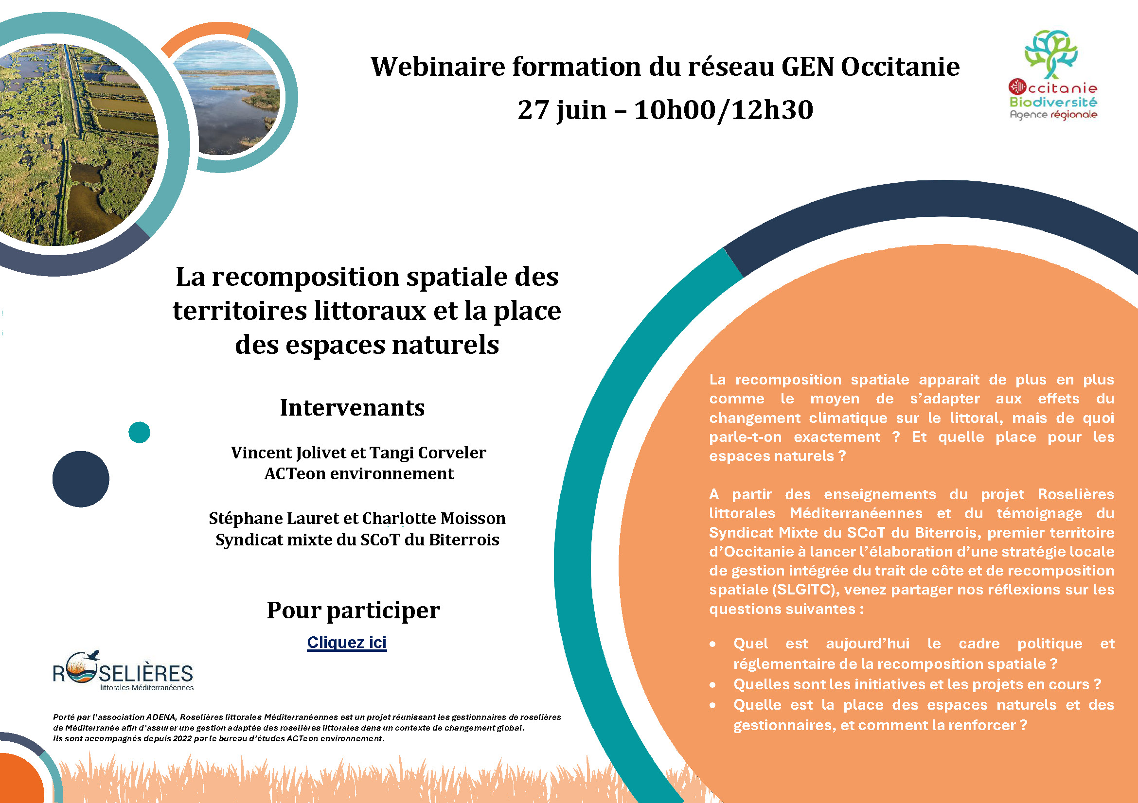 Le réseau GEN Occitanie et l’ADENA organisent avec l’appui d’ACTeon dans le cadre du projet « Roselières littorales Méditerranéennes », un webinaire sur « La recomposition spatiale des territoires littoraux et la place des espaces naturels », le vendredi 27 juin de 10h à 12h30.