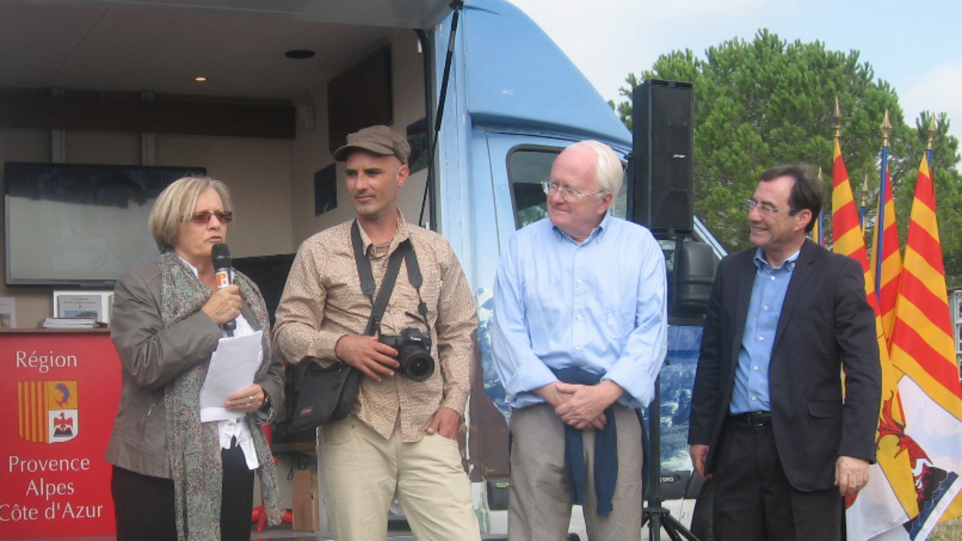 Mme Bat, vice-présidente de la commission culture du Parc Naturel Régional de la Narbonnaise en Méditerranée, s’est vue remettre le prix des mains de M. Schiavetti, Président du Parc Naturel Régional de Camargue, en présence de M. Vauzelle, Président de la Région Provence-Alpes-Côte d’Azur, lors de la fête du Parc Naturel Régional de Camargue, le 27 octobre 2013.