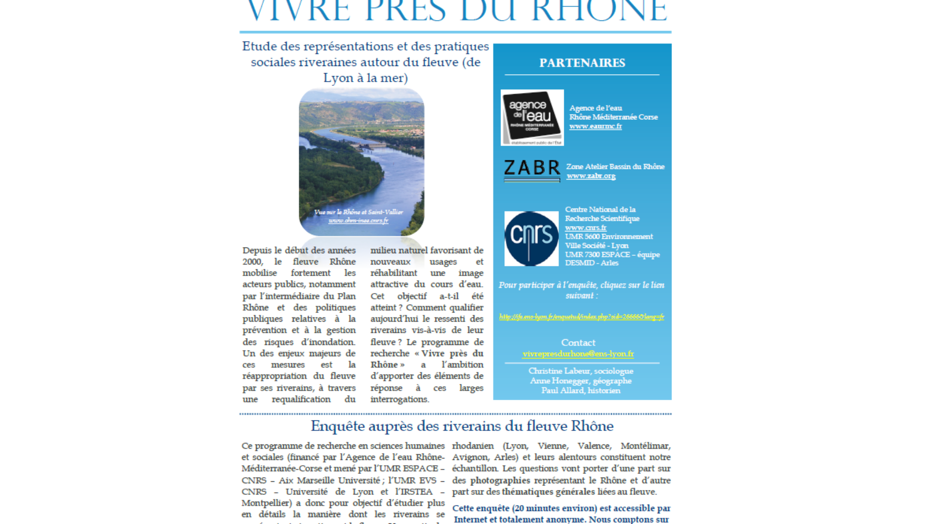 Dans le cadre du programme de recherche « Vivre près du Rhône », qui étudie les représentations et les pratiques sociales autour du fleuve, une enquête auprès des riverains du fleuve Rhône (de Lyon à la mer) est réalisée.