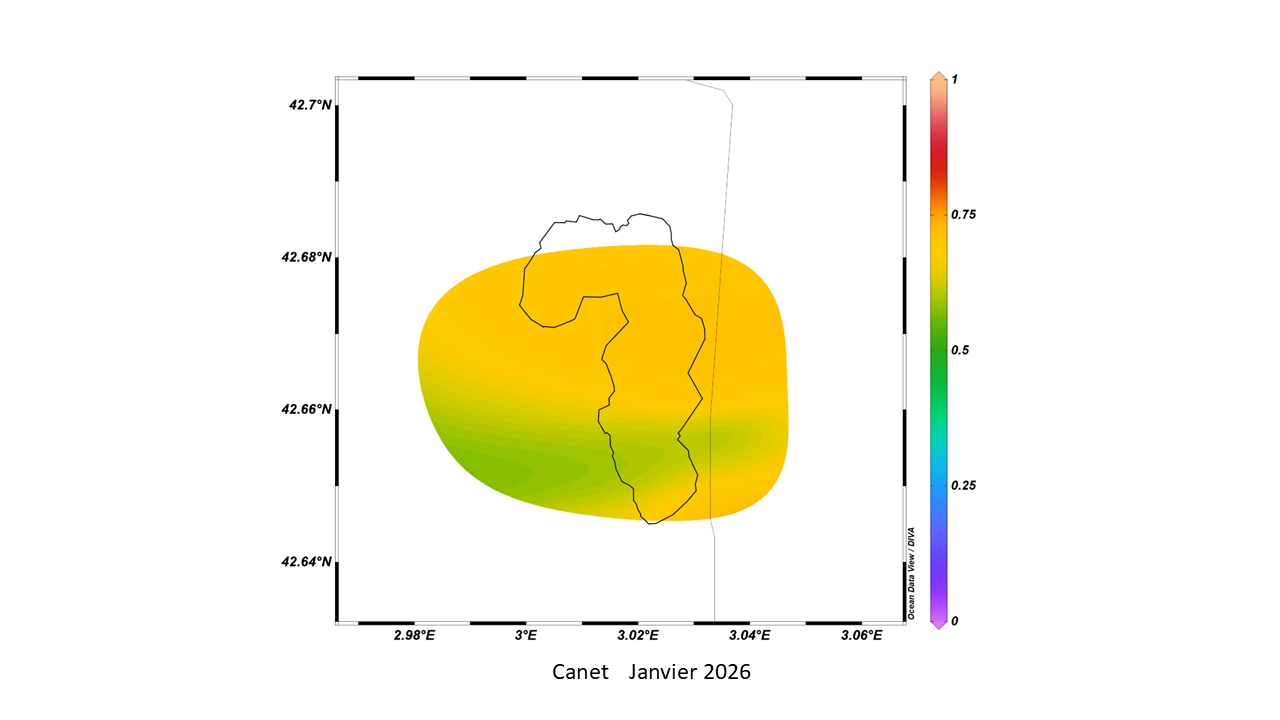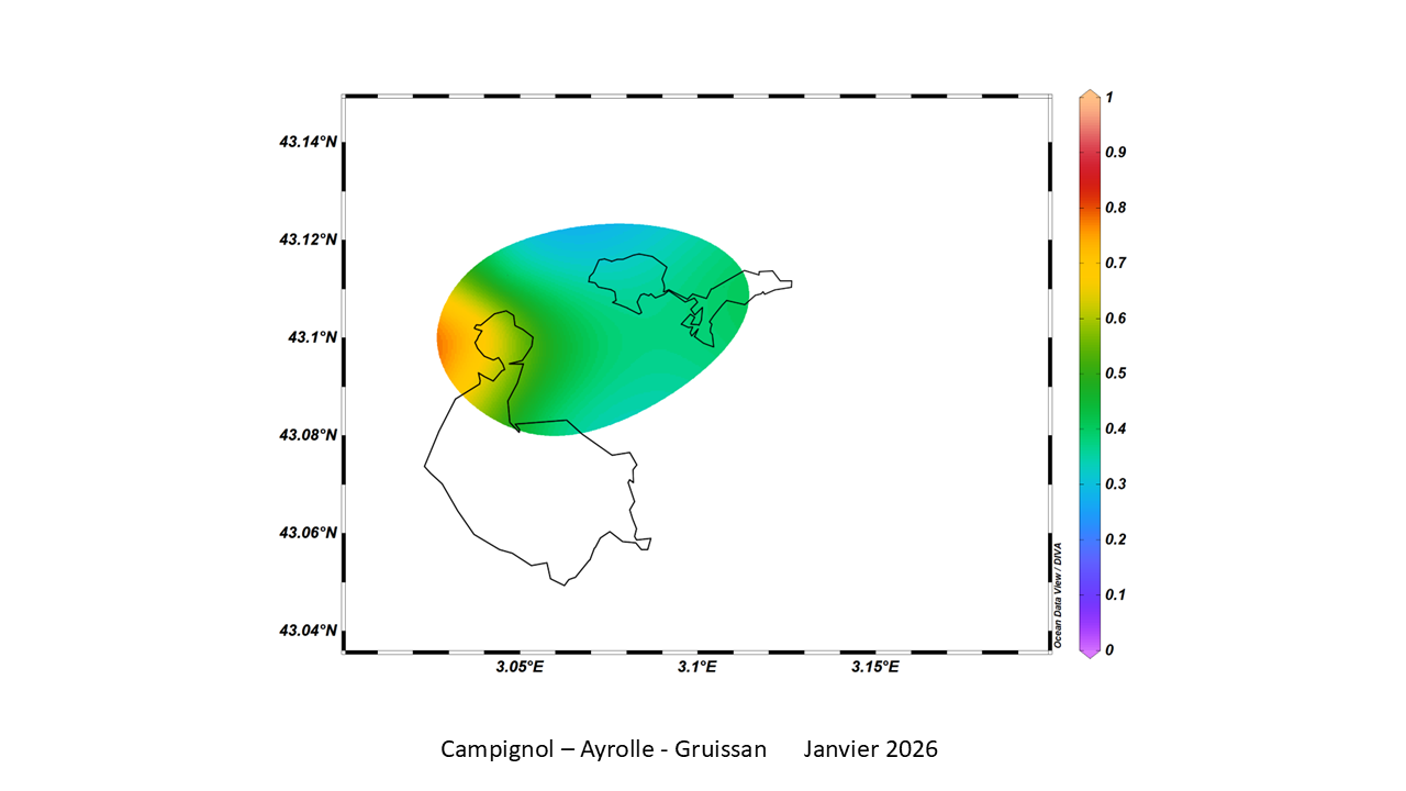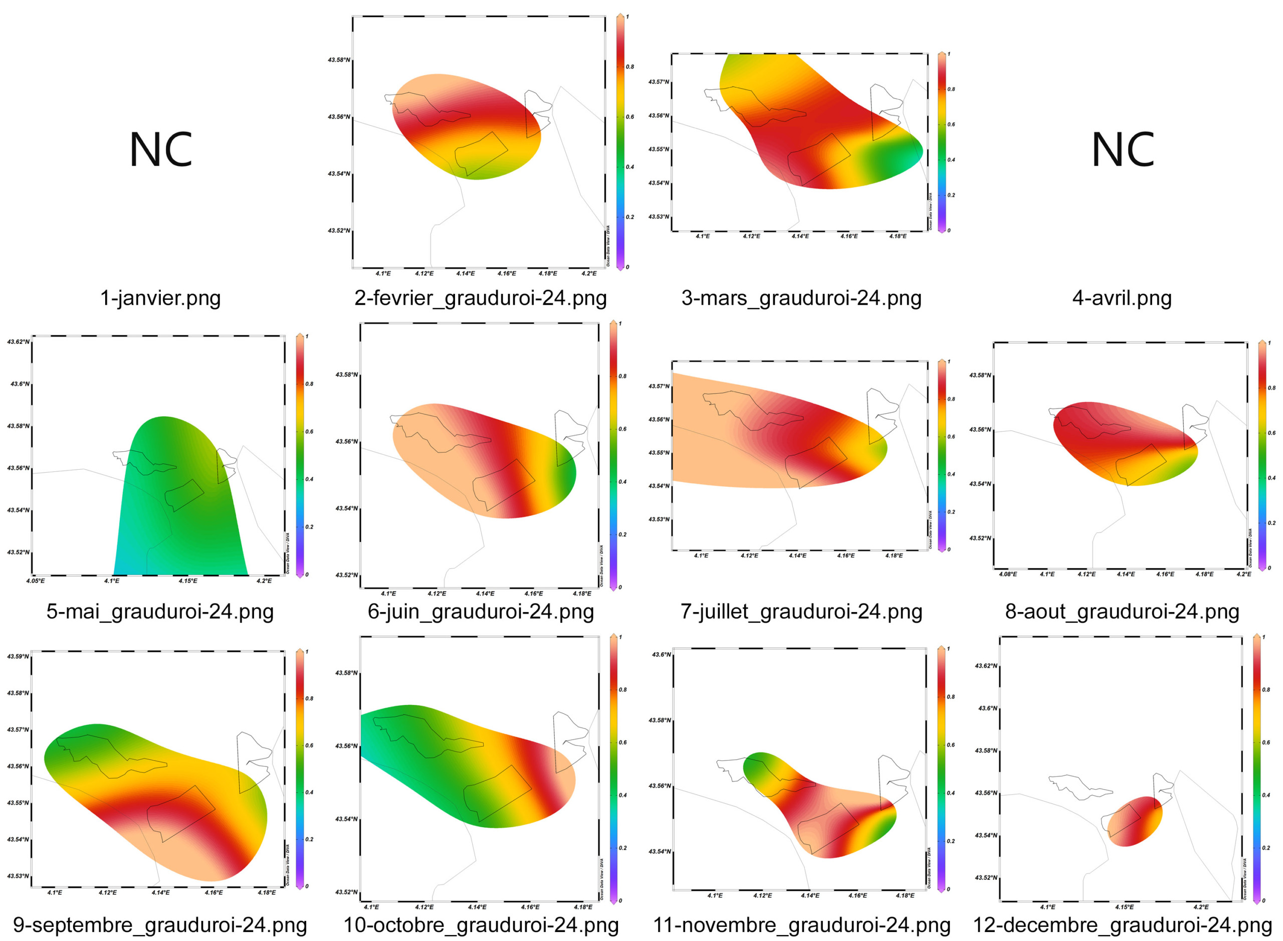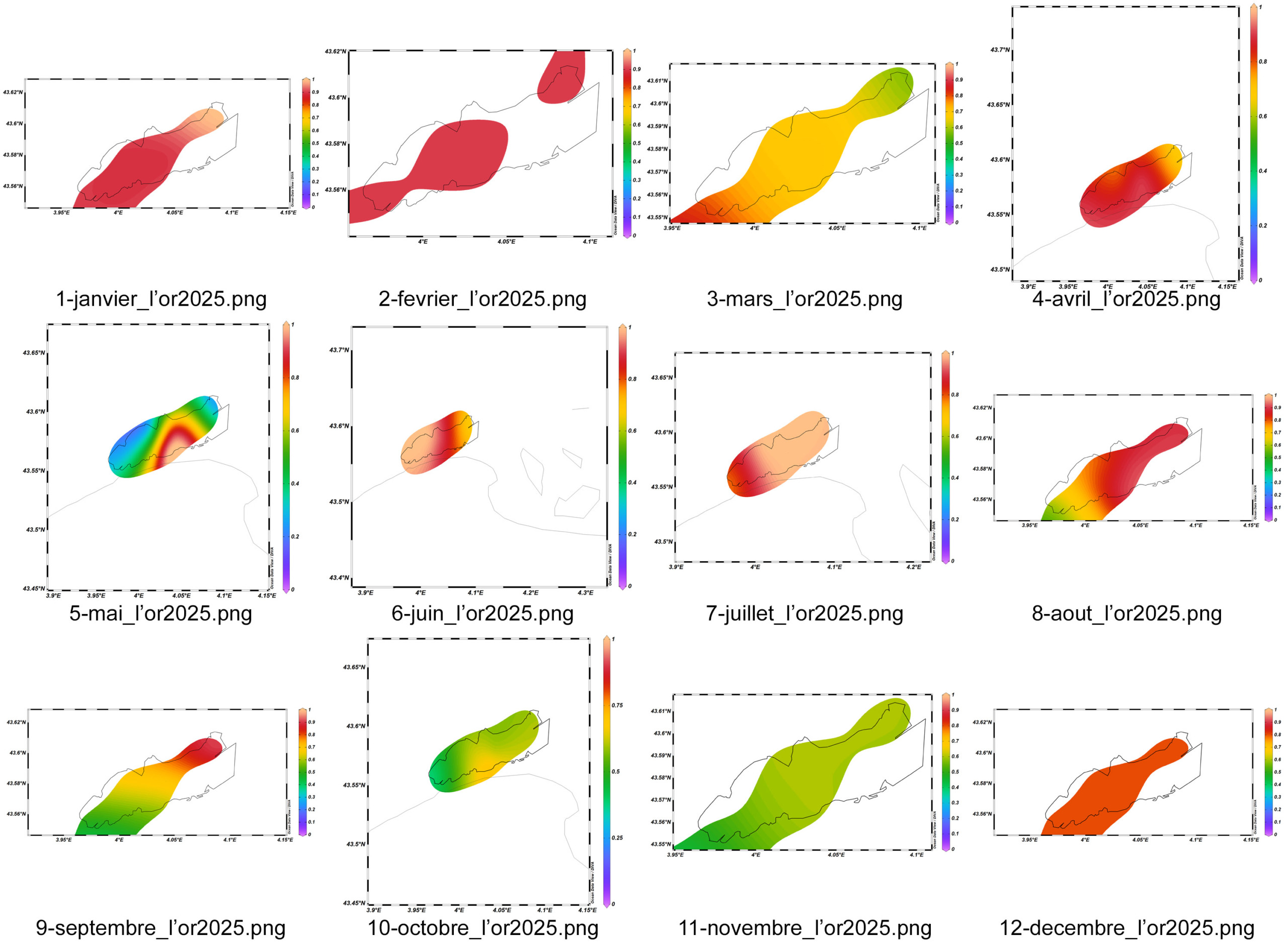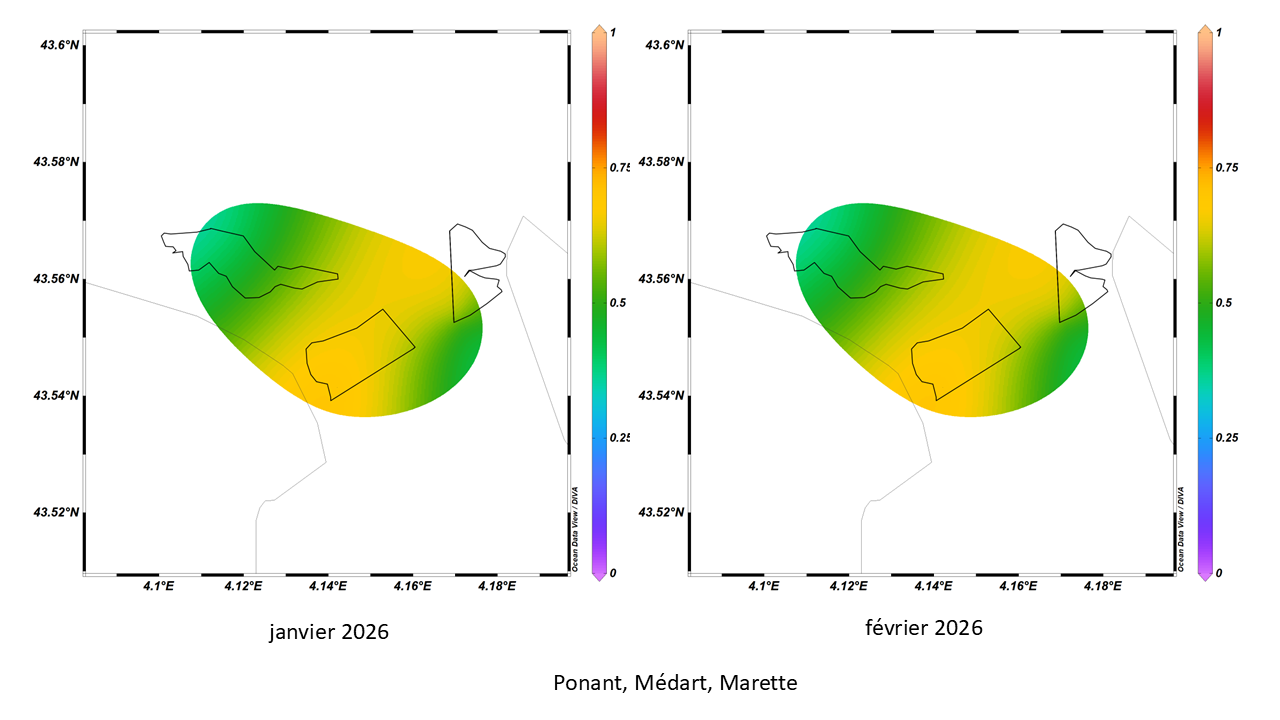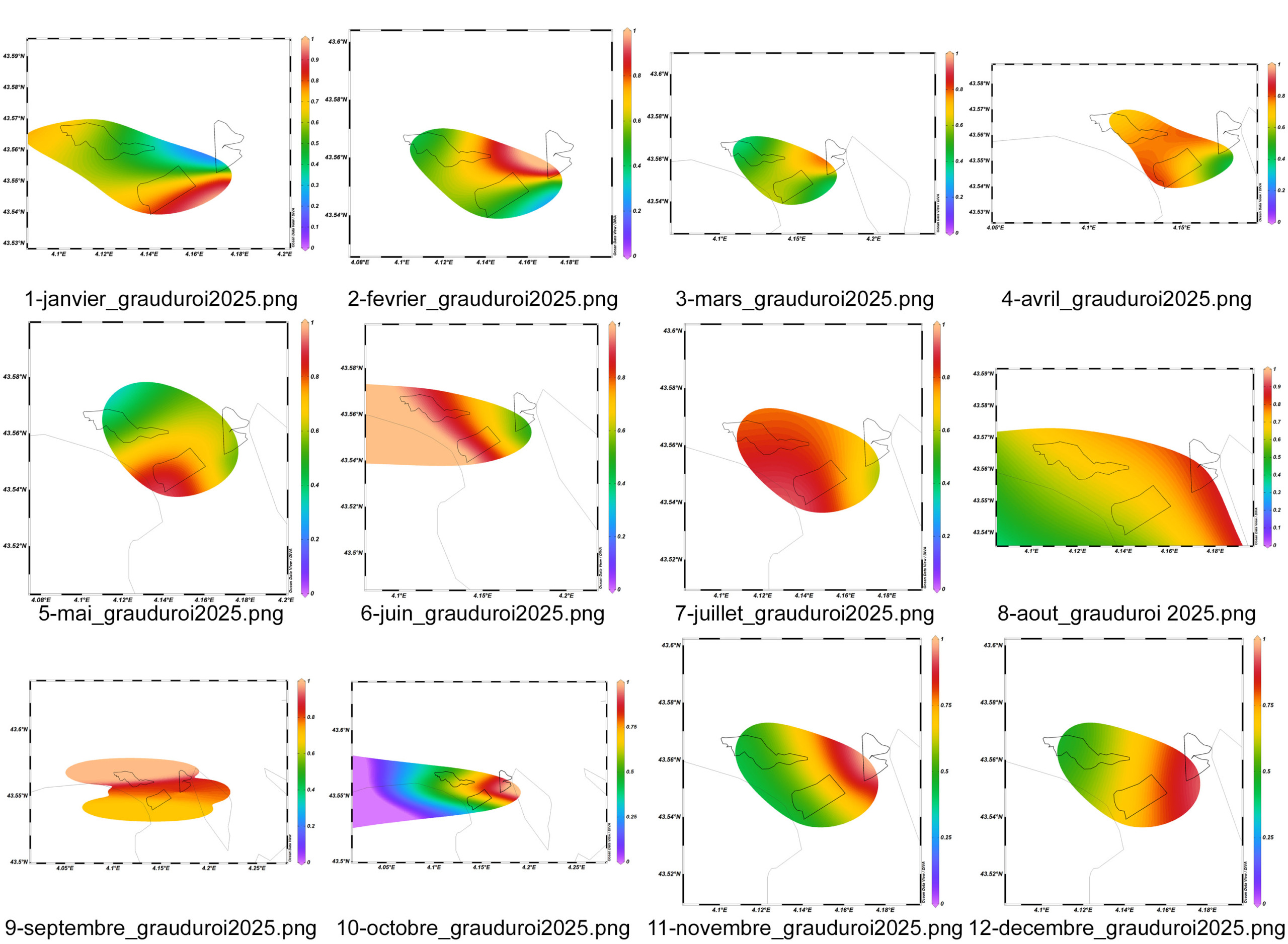 Pour la 1ère année du projet le CRPMEM Occitanie s’est appuyé sur l’outil cartographique mis en disposition par Marchessaux et al. qui permet de visualiser l’indice de tolérance haline du crabe bleu (Salinity Habitat Suitability Index) à la fois mensuellement et à l’échelle des différentes lagunes d’Occitanie. Les données employées dans le modèle sont celles issues du suivi physico-chimique mensuel des lagunes (FILMED) ou d’autres suivis complémentaires par les gestionnaires des lagunes.
