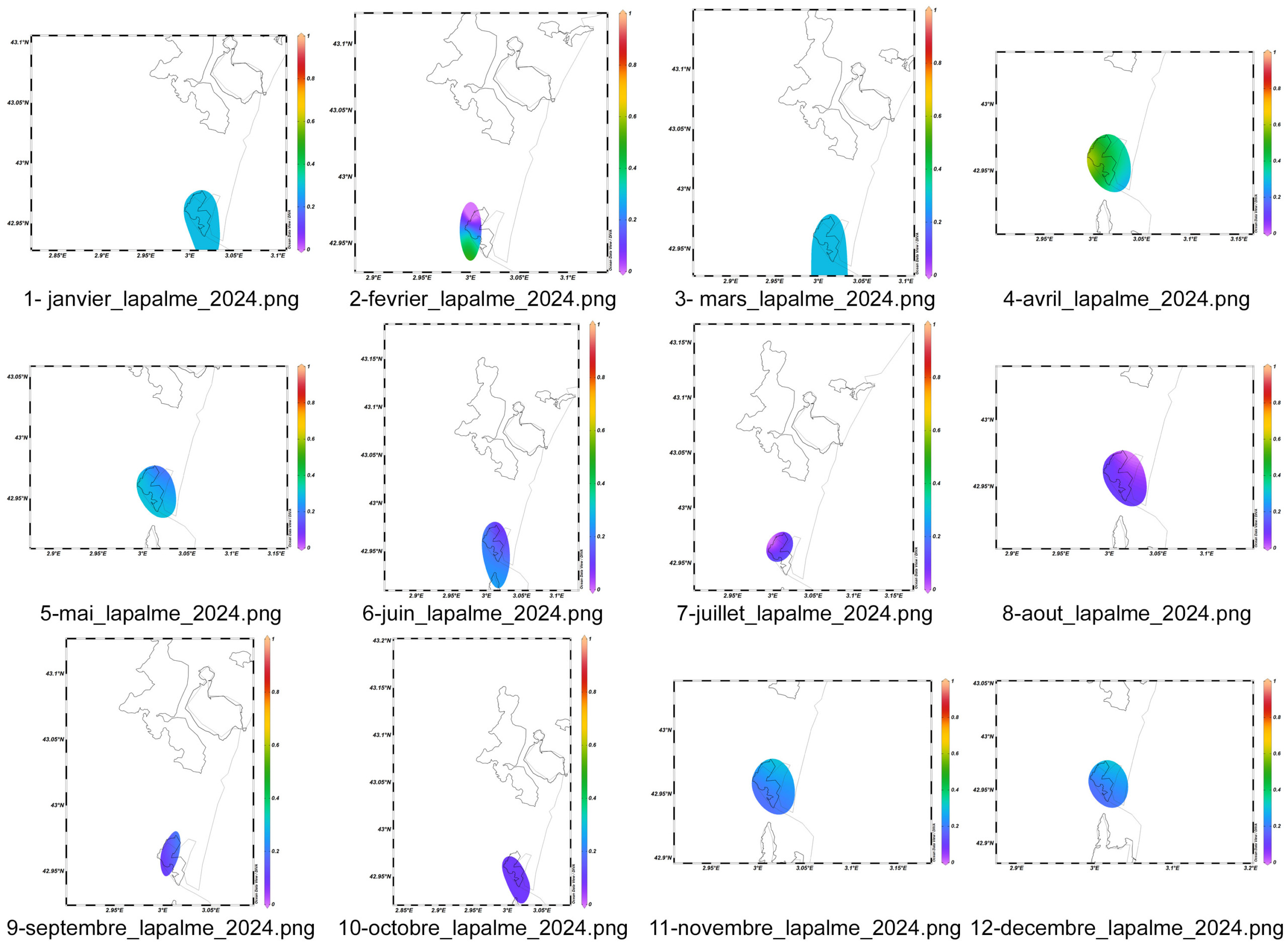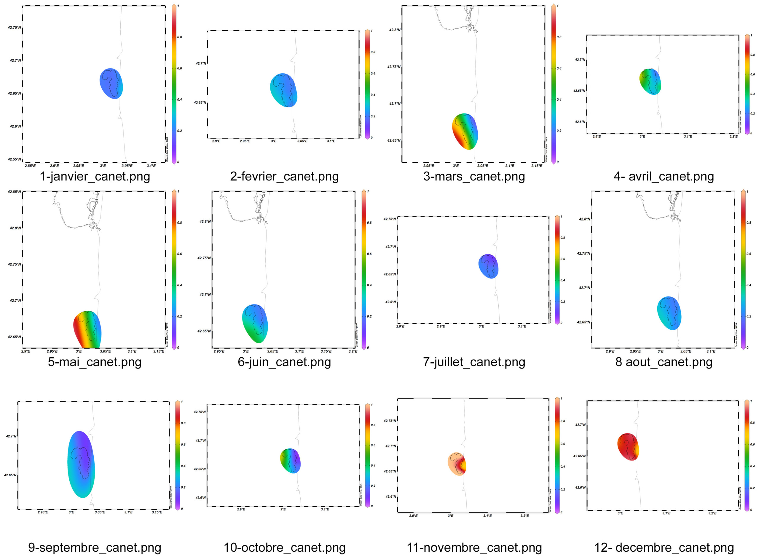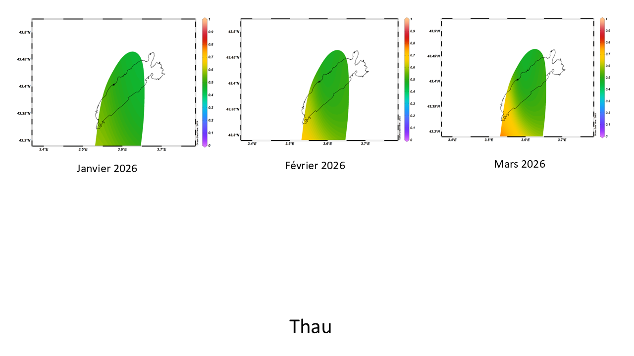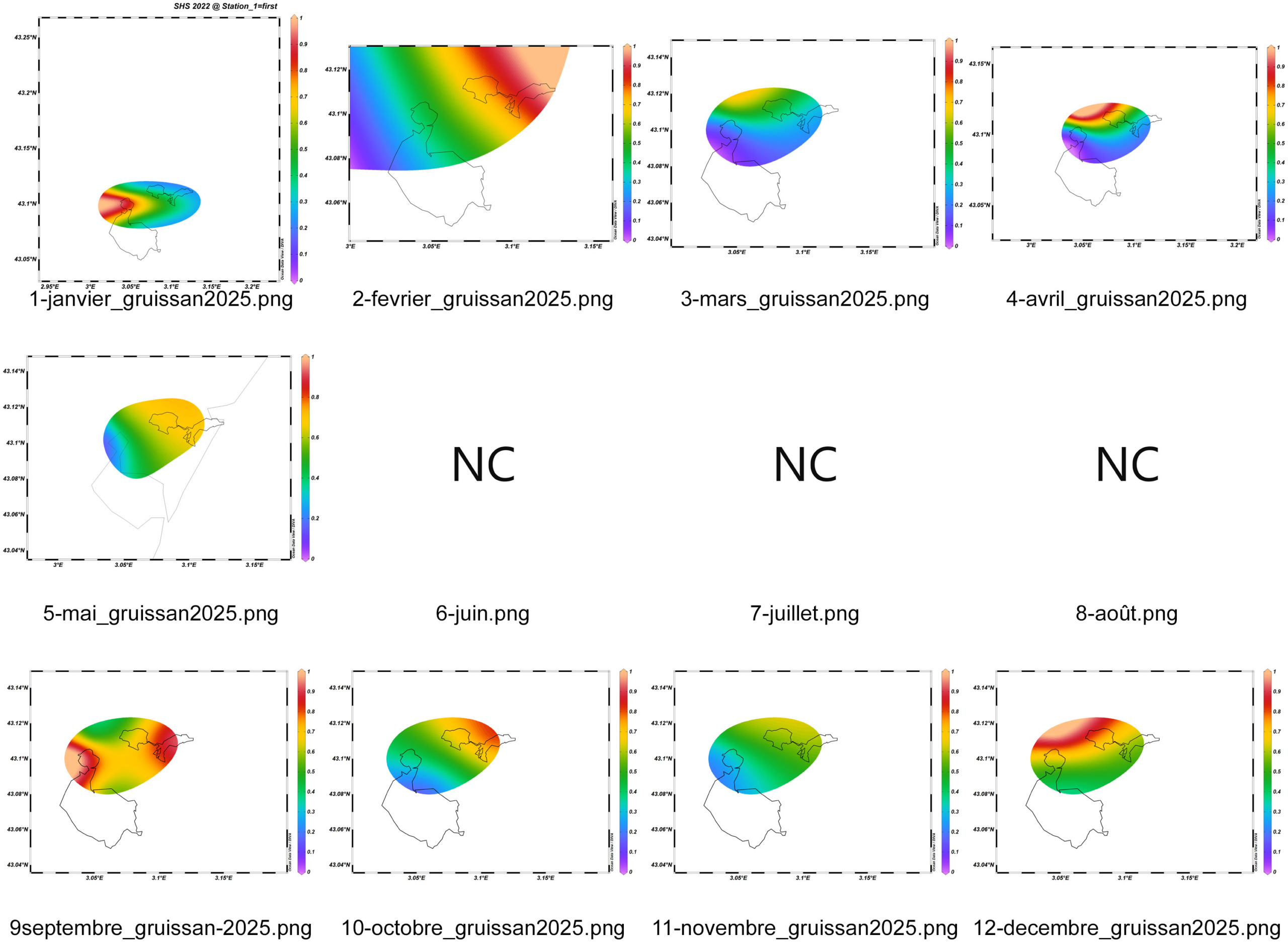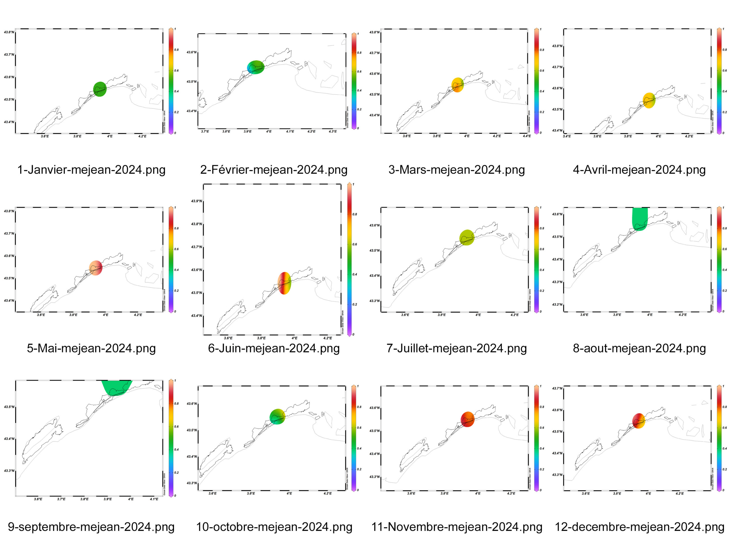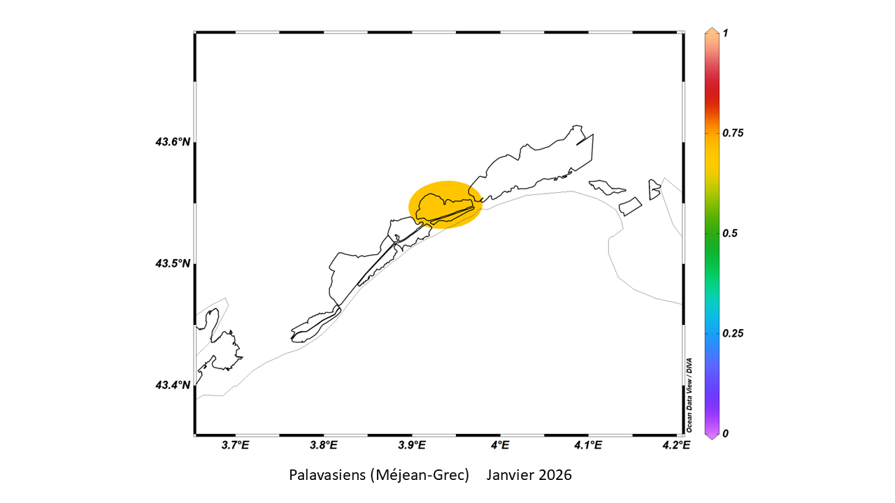 Pour la 1ère année du projet le CRPMEM Occitanie s’est appuyé sur l’outil cartographique mis en disposition par Marchessaux et al. qui permet de visualiser l’indice de tolérance haline du crabe bleu (Salinity Habitat Suitability Index) à la fois mensuellement et à l’échelle des différentes lagunes d’Occitanie. Les données employées dans le modèle sont celles issues du suivi physico-chimique mensuel des lagunes (FILMED) ou d’autres suivis complémentaires par les gestionnaires des lagunes.
