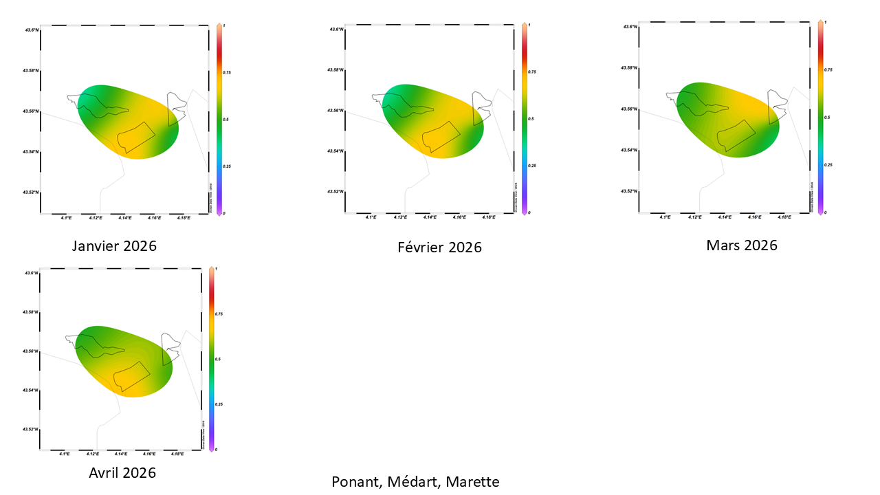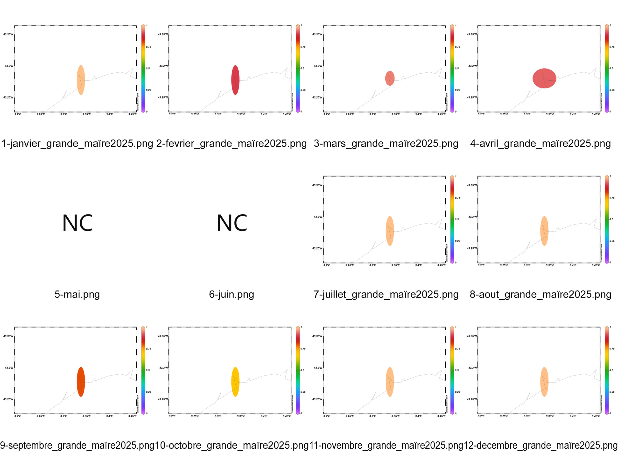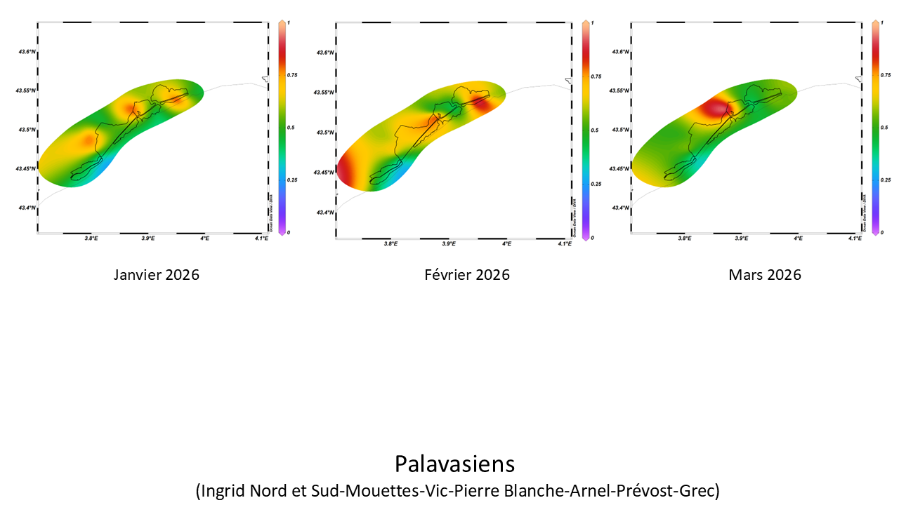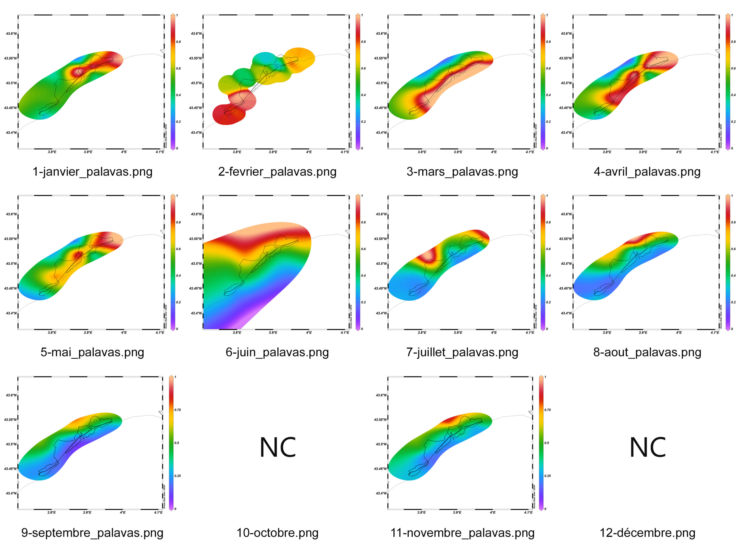 Mensuellement, le CRPMEM Occitanie diffuse un bulletin au comité technique du projet pour le tenir informé des lagunes les plus favorables au crabe bleu selon le Salinity Habitat Suitability Index.